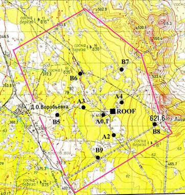 Конфигурация сейсмической группы следующая: вокруг центра BVA0, BVA1 на окружностях с радиусами ~700м и ~1500 м. расположены два контура скважин с сейсмическими датчиками. Центральный датчик (BVA0) – широкополосный, трехкомпонентный CMG-3TB (Guralp), остальные 9 сейсмометров однокомпонентные, вертикальные GS21 (Geotech Instruments).
